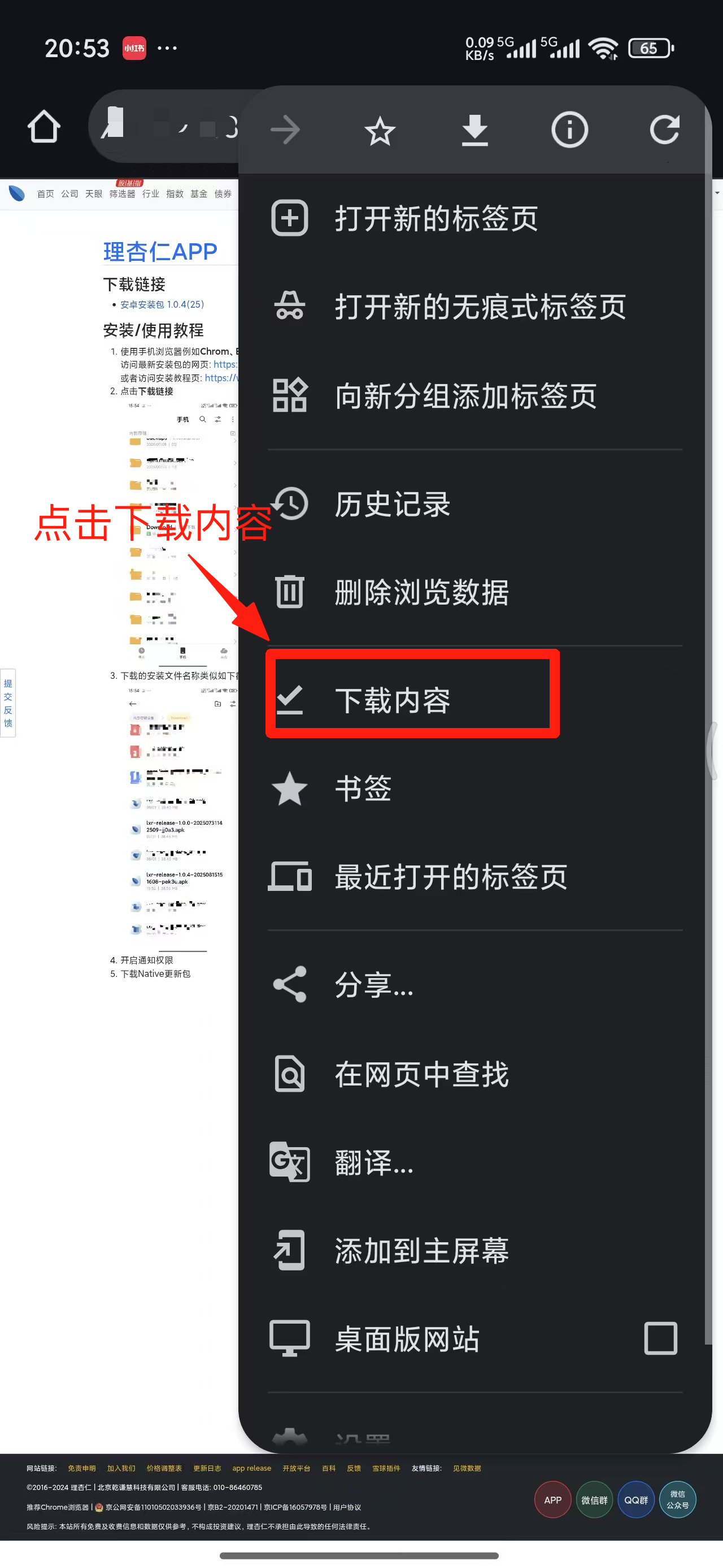 安卓安装包 1.0.14 (35) - 下载成功后点击浏览器菜单。