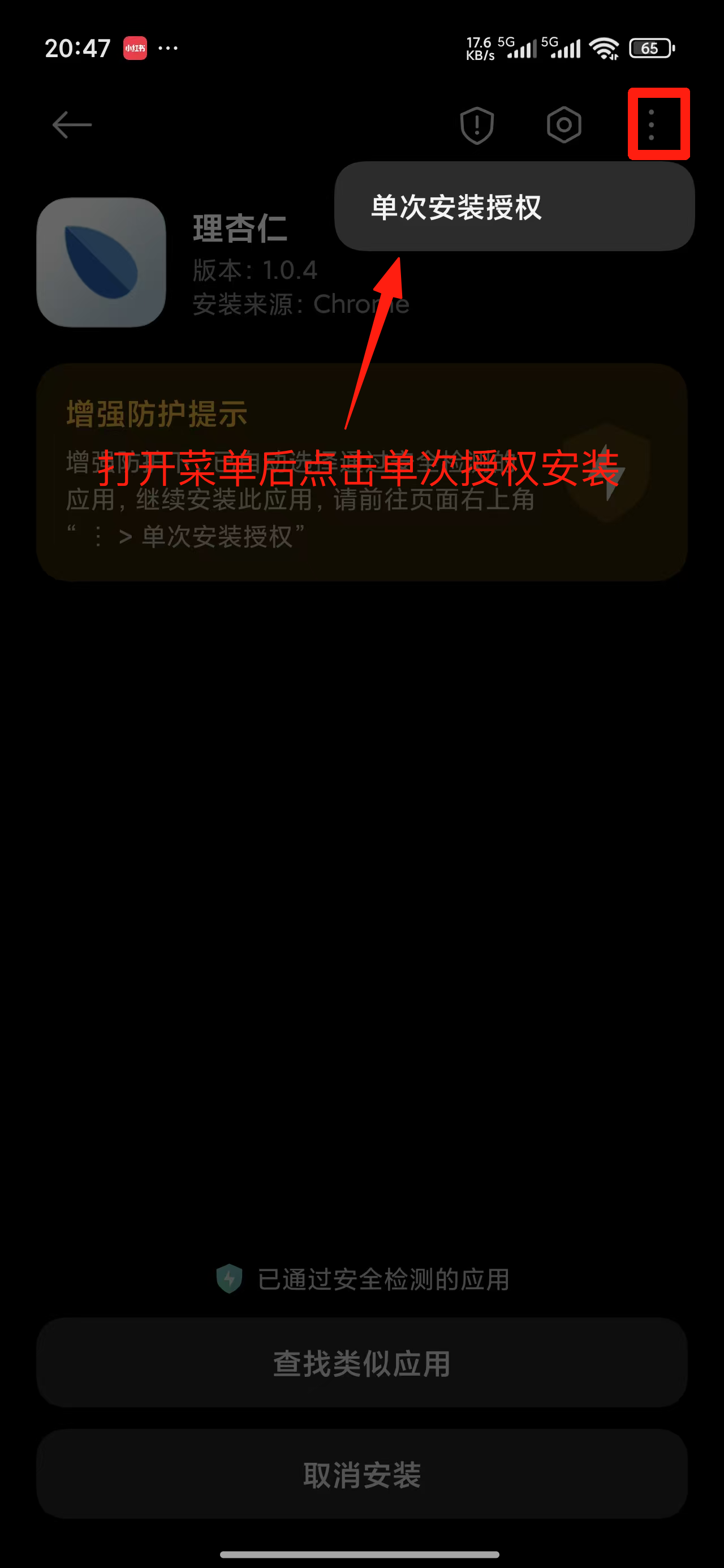 - 手机已开启类似安全守护类的系统保护,您可以点击右上方的单次授权安装。
